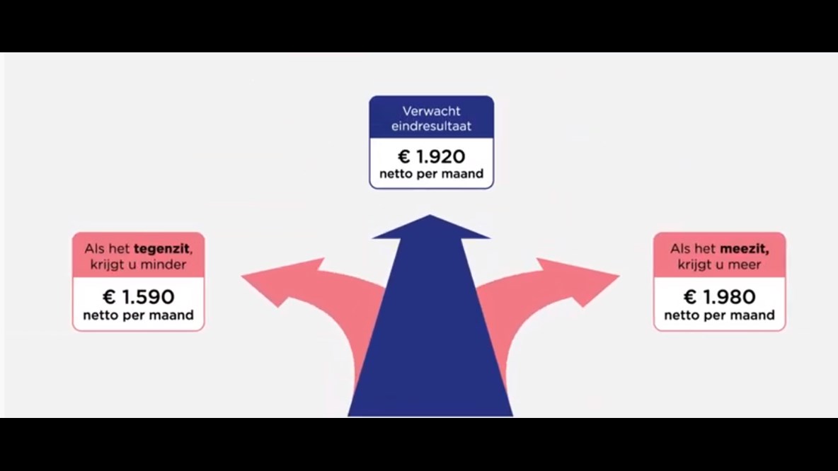 Since September 2019, everyone who accrues a pension has a better understanding of the level of retirement income they can expect. Three different amounts are shown in MijnZwitserleven, each of them calculated according to an expected scenario, a best-case scenario and a worst-case scenario. The scenarios are also shown on the UBS 2020. Watch the video for more information.